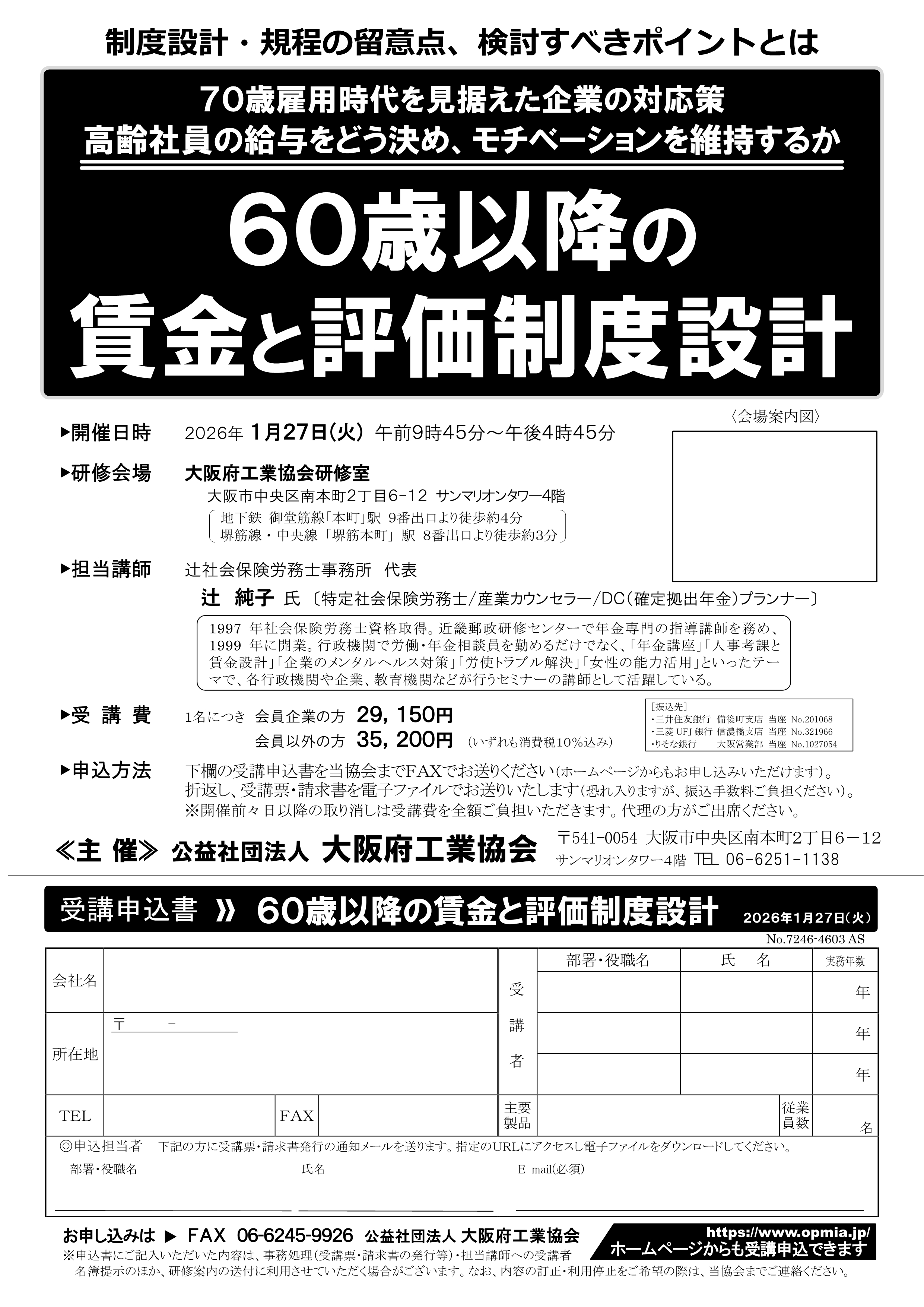 「同一労働同一賃金」が法制化されたことを踏まえ、高齢社員の職務内容・責任・評価をもとに、公平・公正感のある、納得性の高い給与テーブルを構築するセミナーです。